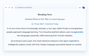 Timely Learning (Beta) is een innovatieve Chrome-extensie die het leren van vreemde talen vergemakkelijkt door woorden op webpagina's te vertalen. Het vervangt bepaalde woorden met hun vertalingen, waardoor gebruikers de nieuwe vocabulaire in context kunnen absorberen. Dit maakt het mogelijk om zonder extra studietijd een taal te leren, ideaal voor kinderen en volwassenen die de natuurlijke manier van leren willen omarmen. De extensie ondersteunt verschillende talen, waaronder Engels, Spaans, Duits, Frans, Italiaans en Hindi, en biedt meer dan 5000 woorden per taalrichting.